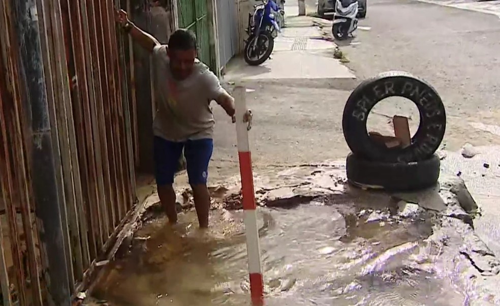 De acordo com os moradores do local, o vazamento começou na madrugada na calçada de um estabelecimento comercial. A força da água danificou a estrutura da calçada formando uma cratera, invadiu a via e se acumula na região.